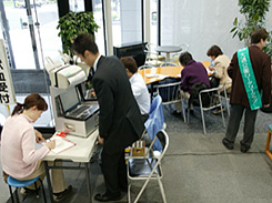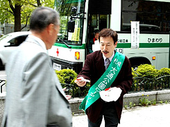 事前に会員の職場や家族、友人知人に声をかけ、また、通りでは会員が手分けをして日赤から提供されたティッシューペーパーを配り、通行人に献血への協力をお願いしました。
